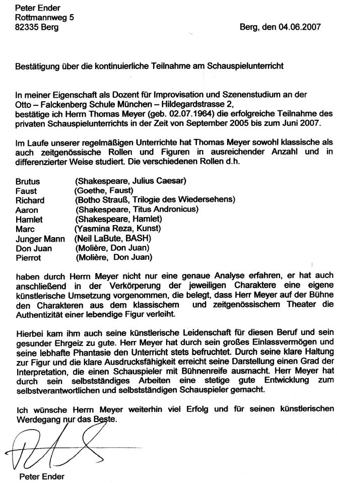 Referenz (Bühnenreife, formal als Bestätigung für Agenturen (kein ´workshop´) :